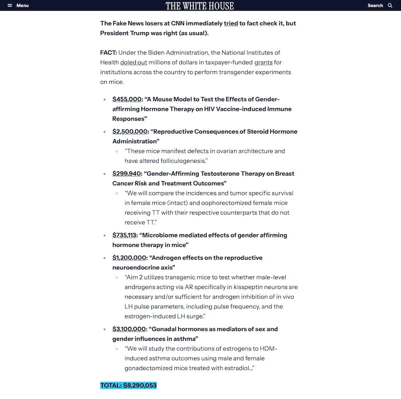 “The morning after Trump’s speech, the White House provided a list of $8.3 million in federal grants to health studies that involve mice receiving treatments that can be used in gender-affirming health care,” CNN’s corrected article stated.