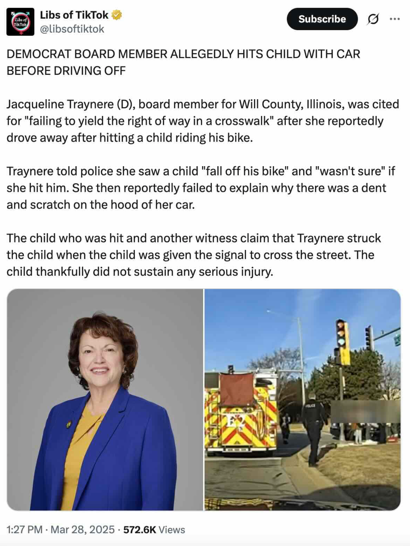 Jackie Traynere, a Will County Board member, was only cited for failing to yield on a right-of-way after her vehicle collided with a child in a crosswalk. Several witnesses stated that as the child, who was riding his bicycle from a sidewalk, entered the crosswalk—while southbound traffic remained stopped—Traynere’s car made an improper turn and hit him.