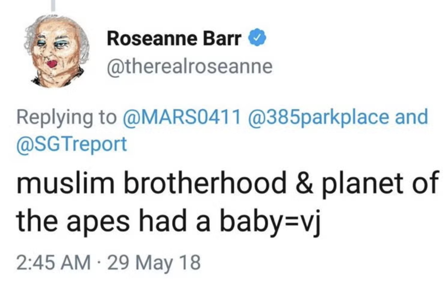 “ABC decided to cancel their highest rated show ‘Roseanne’ following a tweet in which Roseanne compared an African-American woman, a former advisor to President Obama to an ape, which did not sit well with ABC management or anyone with a brain, really.”