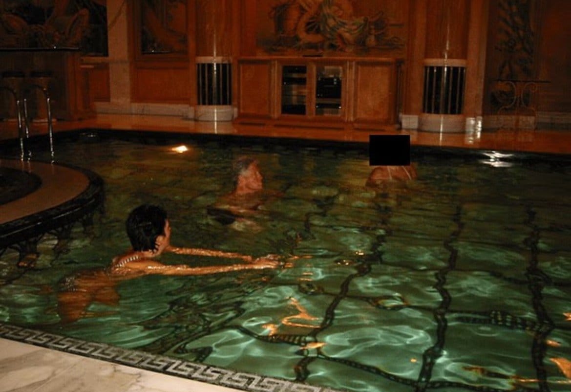 Among the most striking revelations are previously unseen photographs of Bill Clinton in a hot tub with an unidentified woman whose face has been redacted. The redaction suggests the woman may be a victim of sex trafficking and possibly a minor. Other images show Clinton aboard a private plane with a woman seated beside him with her arm around him, her face similarly obscured, as well as photos of Clinton swimming with Maxwell and another unidentified individual.