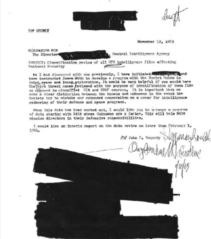 Another document frequently associated with this memo is a letter reportedly sent by Kennedy to the CIA Director, requesting a review of UFO intelligence to prevent potential misidentifications during the Cold War. Some UFO researchers claim that this letter suggests Kennedy was seeking access to classified UFO intelligence, fueling speculation over whether this pursuit had any connection to his assassination.