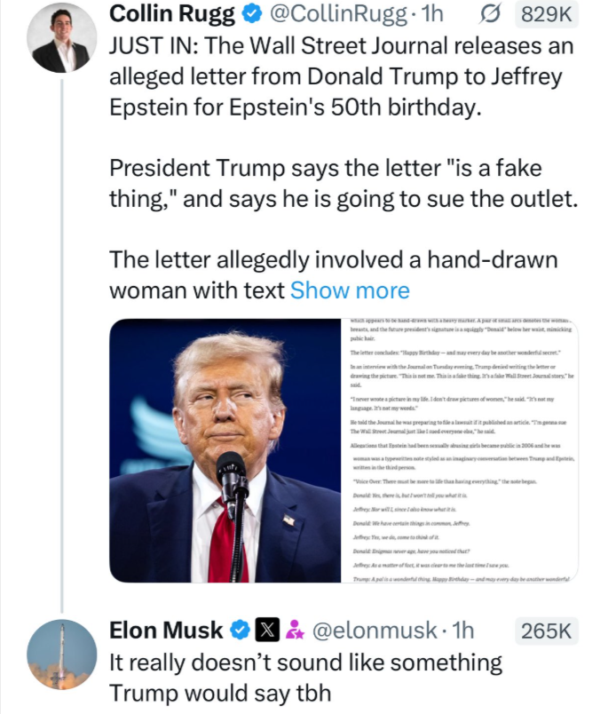 “The Wall Street Journal printed a FAKE letter, supposedly to Epstein. These are not my words, not the way I talk. Also, I don’t draw pictures. I told Rupert Murdoch it was a Scam, that he shouldn’t print this Fake Story. But he did, and now I’m going to sue his ass off, and that of his third rate newspaper,” he posted.